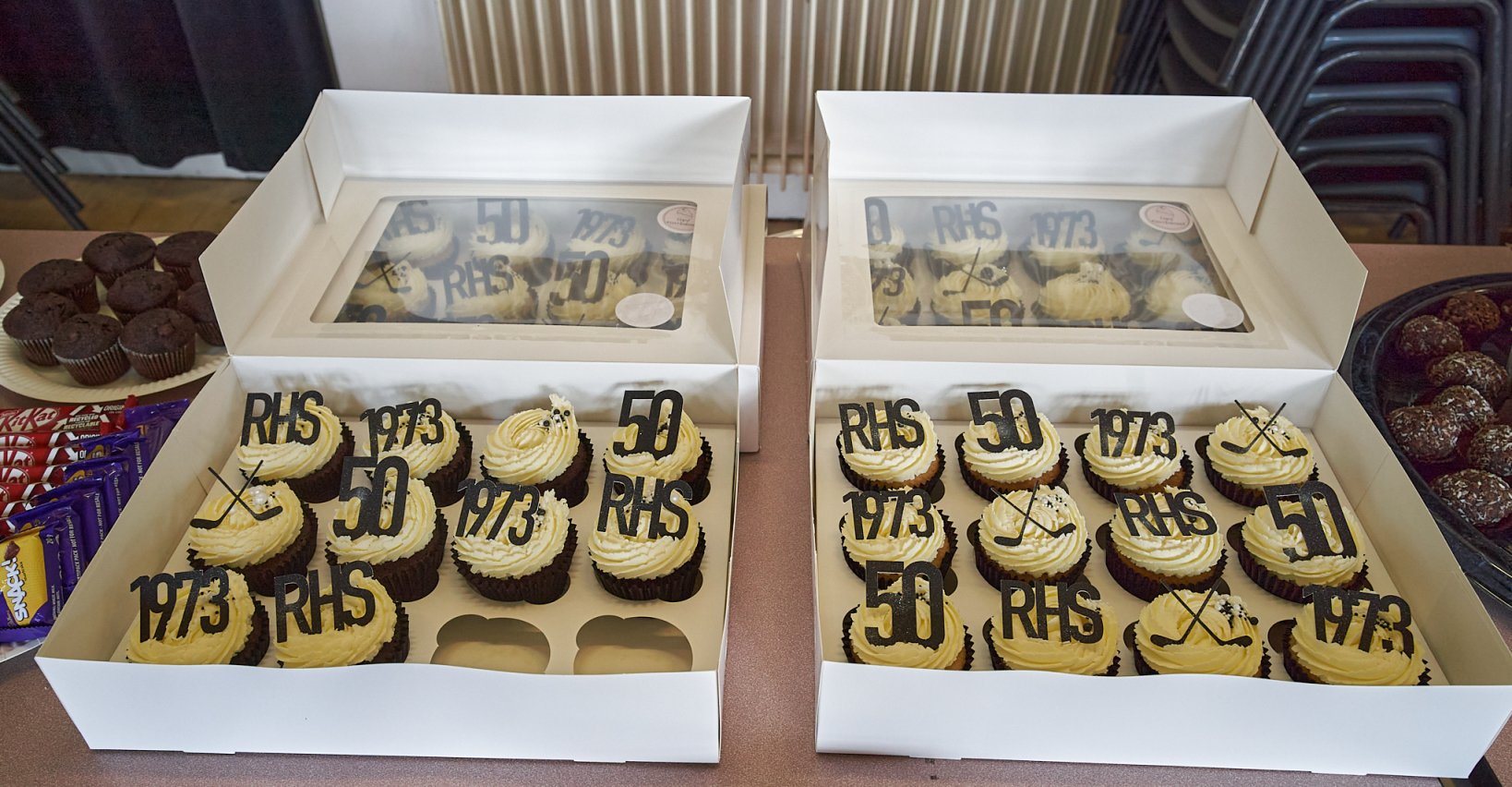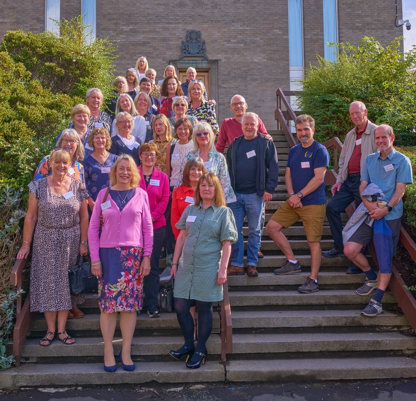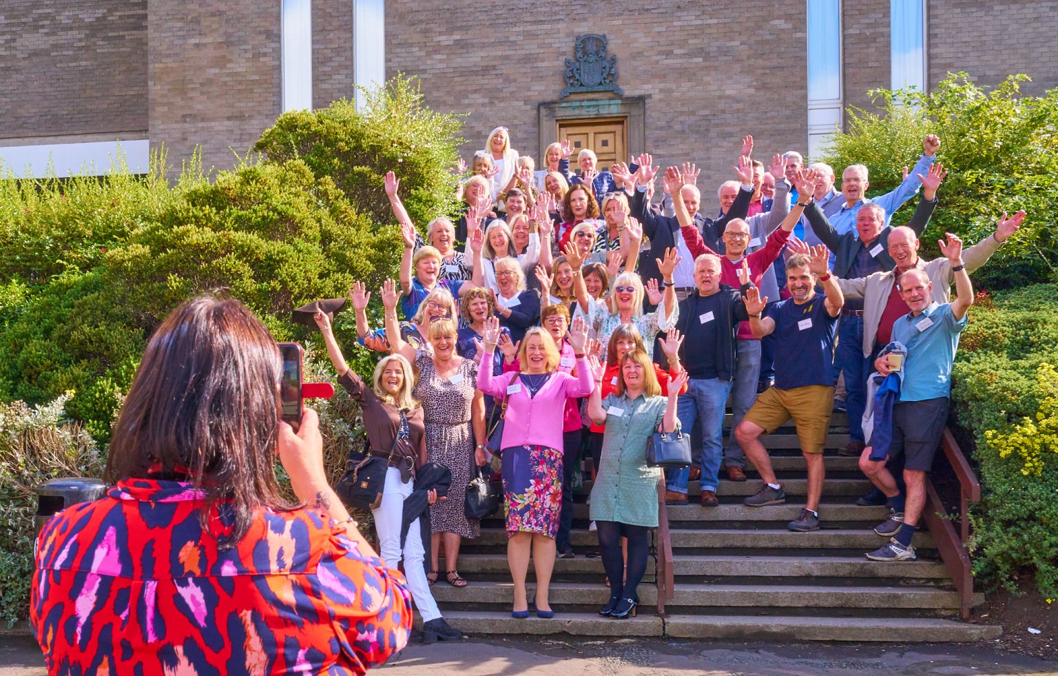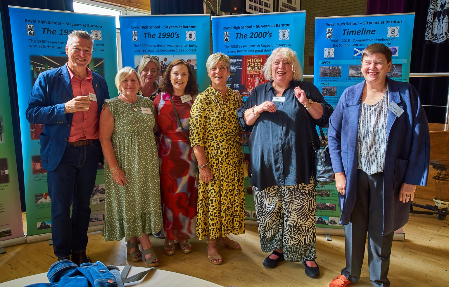 In 1973, The Evening News celebrated the arrival of Girls at the Royal High by publishing an iconic photograph showing around 40 of the intake of 80, along with a token representation of five boys. For the 2023 anniversary, boys from the 1973 intake were also invited. Much planning went into the 50th anniversary celebration of the event, held on 25th August this year, with Susie Miller, speaking for the organisers, saying how pleased she was with the turnout and the splendid occasion of the formal part of the event held in the magnificent school assembly hall. Refreshments including specially designed cakes was followed by a tour of the much-changed school (from the 1973 version) led by two current pupils. The recreation of the 1973 photo was photographed on the same set of steps as the original, then the event moved into a more social theme in the nearby Royal High Rugby pavilion, where events included the photographing of those present from each of the six classes which formed the 1973 first year.