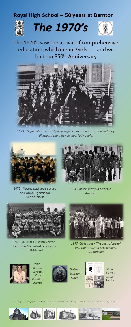 Girls were first admitted to the Royal High School in August 1973, joining what had until then been an all-boys school for almost 850 years. Co-Educational state schools were a principal objective of the then Town Council, and the school, formerly in Regent Road, moved to Barnton in 1968, with its first five years including boys only.