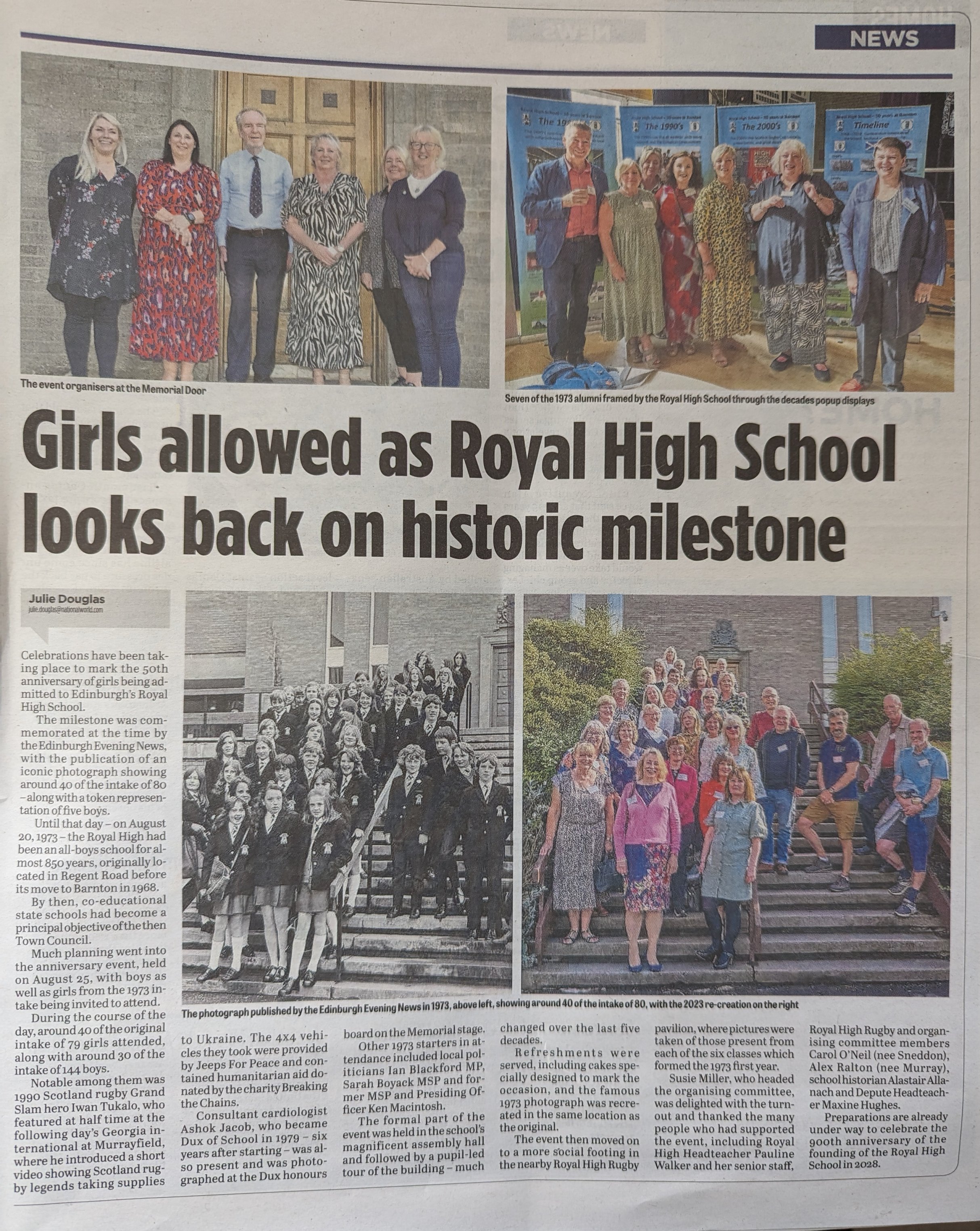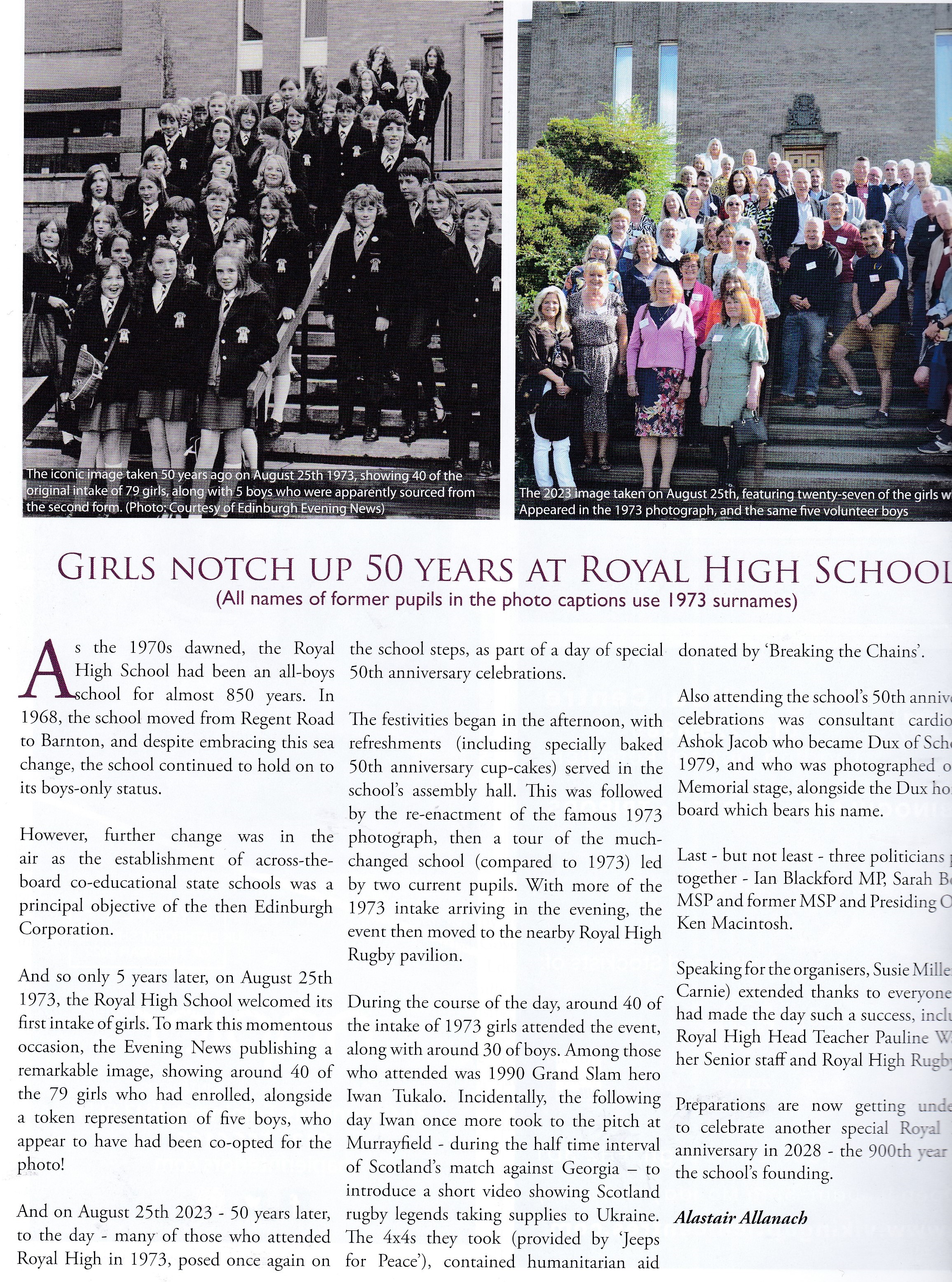 This story has been long in the making. The editor first saw the iconic image in the mid 2000’s, and ever since then had hoped the potential of a re-creation of the event would happen. In 2018, he included it as the key image in the 1970’s decade popup, and after one or more unrecorded reunions of the 1973 Girls, a well-publicised event was held in the School and the Rugby Clubhouse on Friday 25th August 2023, just a few days later than the actual 50th Anniversary on 20th August The following introductory text, account of the events, and substantial gallery formed part of the article in the Edinburgh Evening News on September 6th, and we look forward to seeing the same in Edinburgh Life in November.