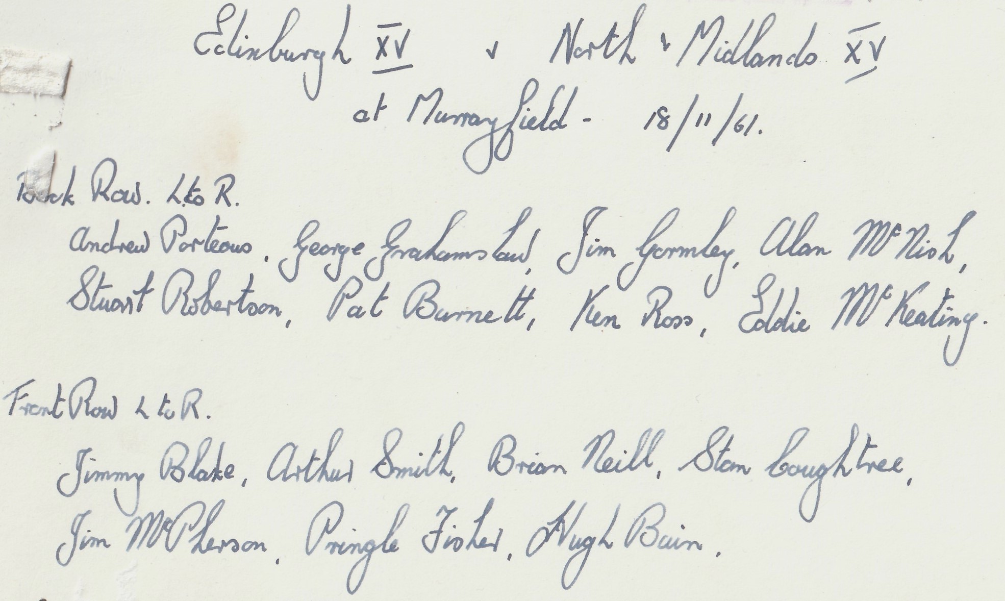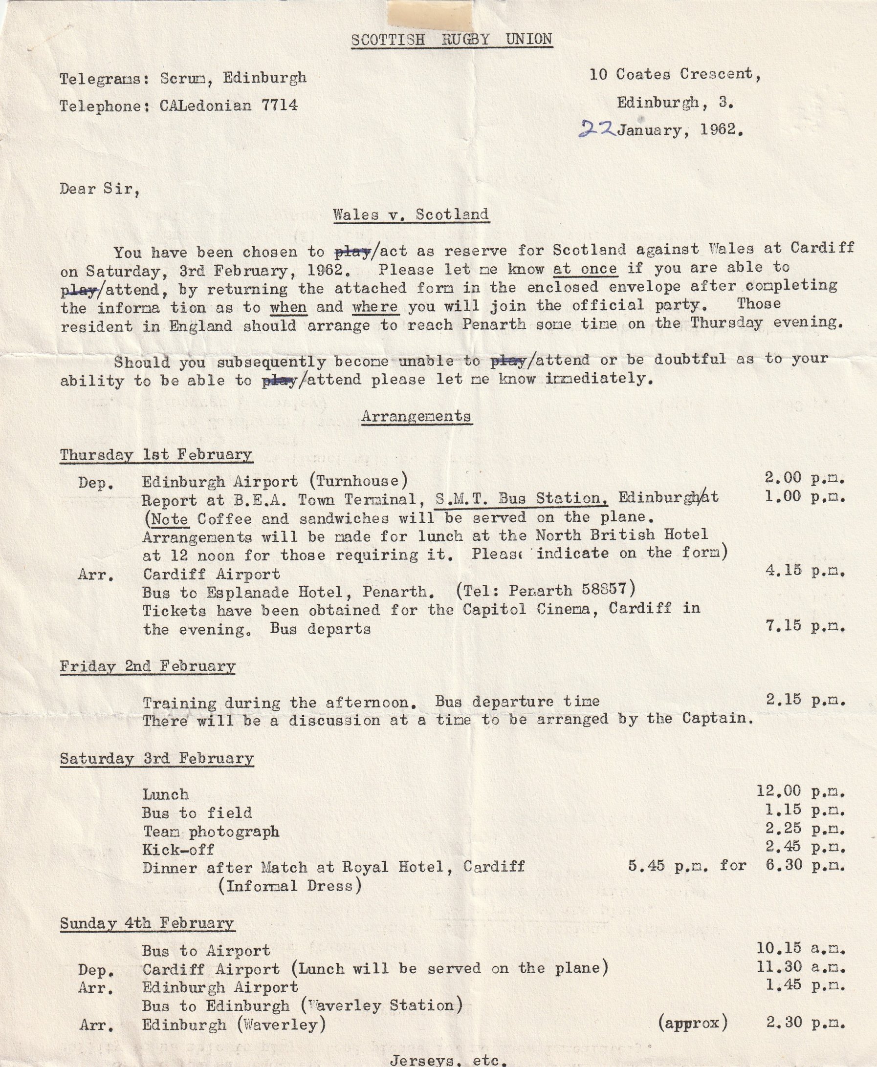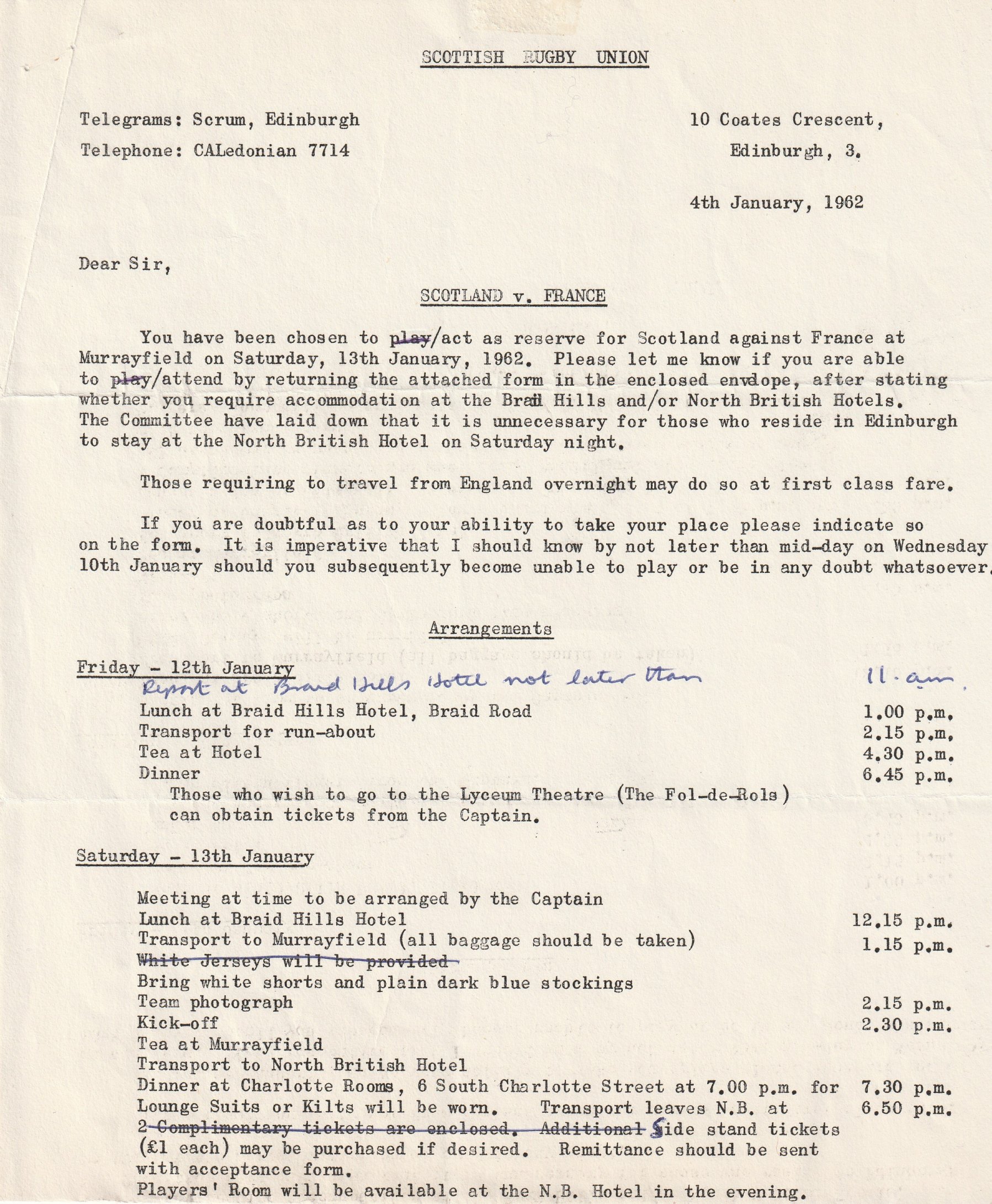 Those that happened were often uncapped, as Bruce Laidlaw and Arthur Orr found on the Argentinian tour of 1969 (later rectified). There were two replacements per team, but they were not used on the day, unlike the current eight which often are all used. and consequentially capped. There are now also typically four Autumn matches in addition to the five in the now six nations tournament, so George (and the other names mentioned) would likely have accumulated several international caps even as replacements. To measure George’s achievement as a trialist, during the Pringle Fisher/ Jimmy Blake era (1961-1967), aside Bruce and Arthur, only one other RHS player – Richard Cameron, was similarly honoured. Pringle Fisher went on to play 25 times for Scotland, captaining them on nine occasions. The peak of George’s rugby-playing career was in 1962, when he was selected as travelling reserve for Scotland three times, against France, Wales and England.