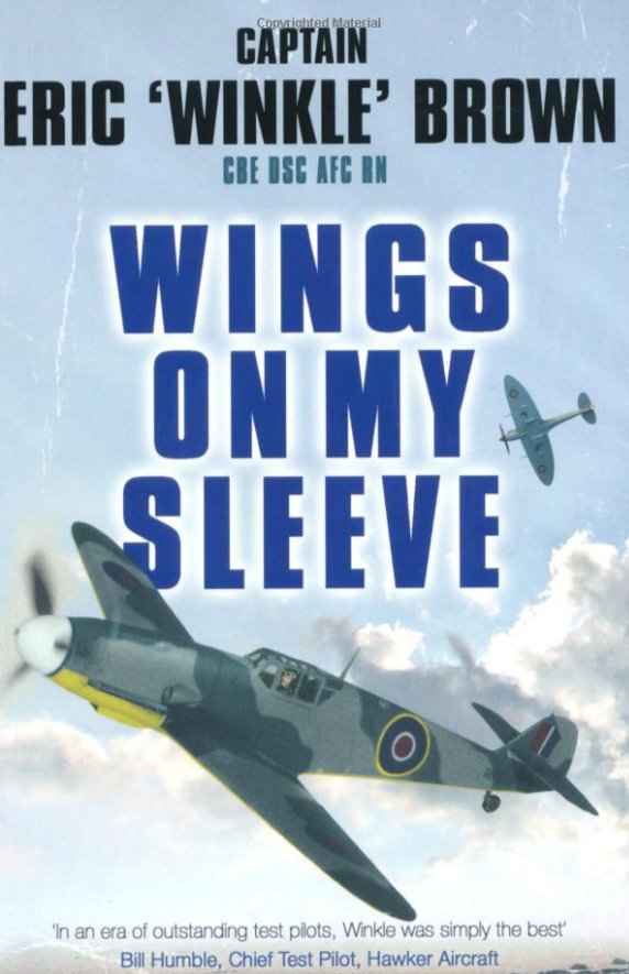 The book dustcover explains its splendid contents: “In 1939 Eric Brown was on a University of Edinburgh exchange course in Germany, and the first he knew of the war was when the Gestapo came to arrest him. They released him, not realising he was a pilot in the RAF volunteer reserve: and the rest is history. Eric Brown joined the Fleet Air Arm and went on to be the greatest test pilot in history, flying more different aircraft types (487) than anyone else. During his lifetime he made a record-breaking 2,407 aircraft carrier landings and survived eleven plane crashes. One of Britain’s few German-speaking airmen, he went to Germany in 1945 to test the Nazi jets, interviewing (among others) Hermann Goering and Hanna Reitsch. He flew the suicidally dangerous Me 163 rocket plane, and tested the first British jets. WINGS ON MY SLEEVE is ‘Winkle’ Brown’s incredible story”.
