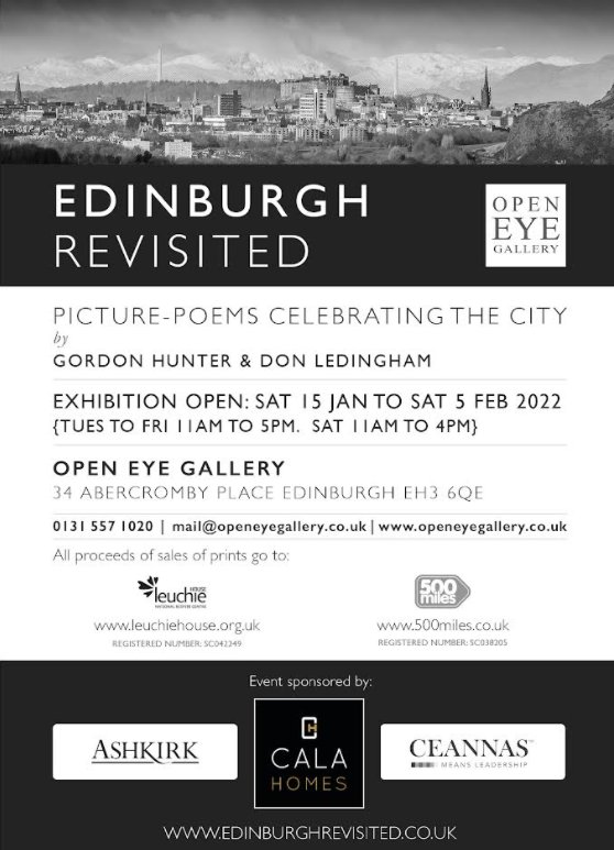 Photographic prints from the book were on view and on sale at the exhibition, which continued until February 5th. Gordon and Don were recently interviewed for ‘The Afternoon Show’ by BBC Radio Scotland’s Grant Stott. All proceeds from the sales of prints and books will go to Leuchie House, a national respite centre, and ‘500 Miles‘, a charity which helps people with mobility difficulties. Copies of the book can be purchased via the Edinburgh Revisited website. The image gallery shown below includes images from the book and from the appointed charities. More info. in FP Authors