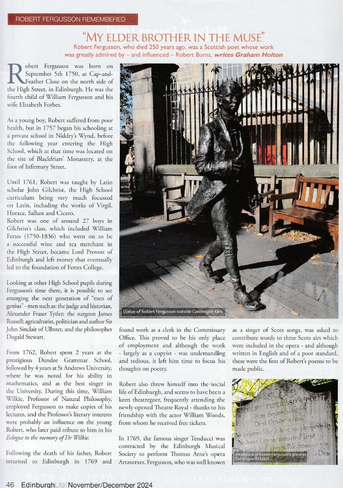 This year, marking the 250th anniversary of his death, will see a number of initiatives including a two-year research project based at Glasgow University, entitled The Collected Works of Robert Fergusson: Reconstructing Textual and Cultural Legacies – click here for the project website. The project aims to produce a new edition of Fergusson’s works in 2026 and to commemorate his legacies through various events.
