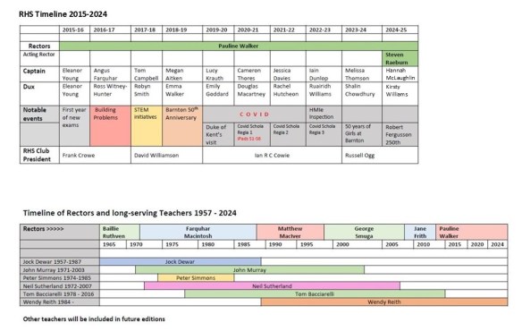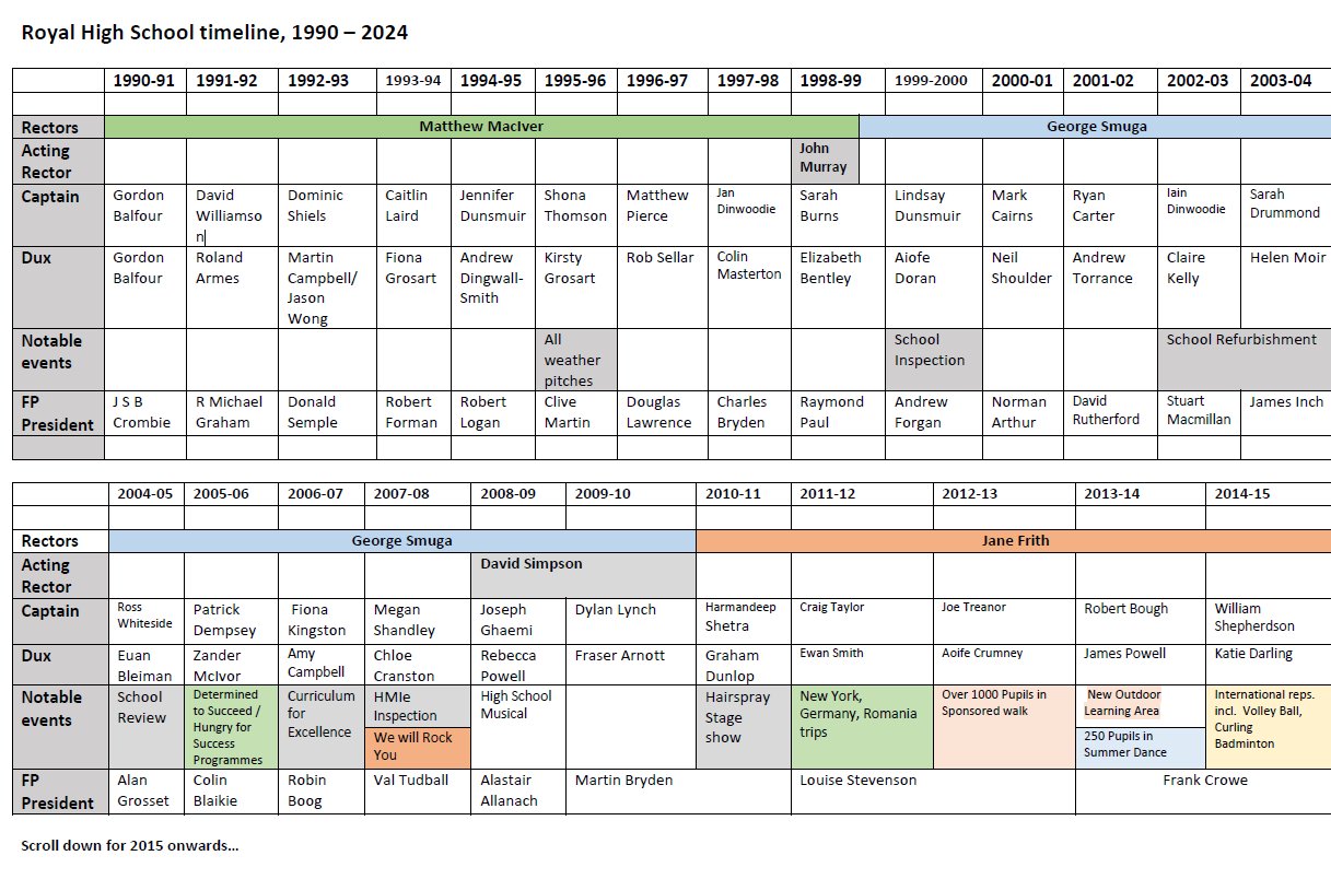 In the meantime, we can offer you a very useful document from the digital history, one which shows a timeline from 1990 through 2020, in respect of Duxes, Captains, Rectors, Notable Events, and RHS Club Presidents for every year.